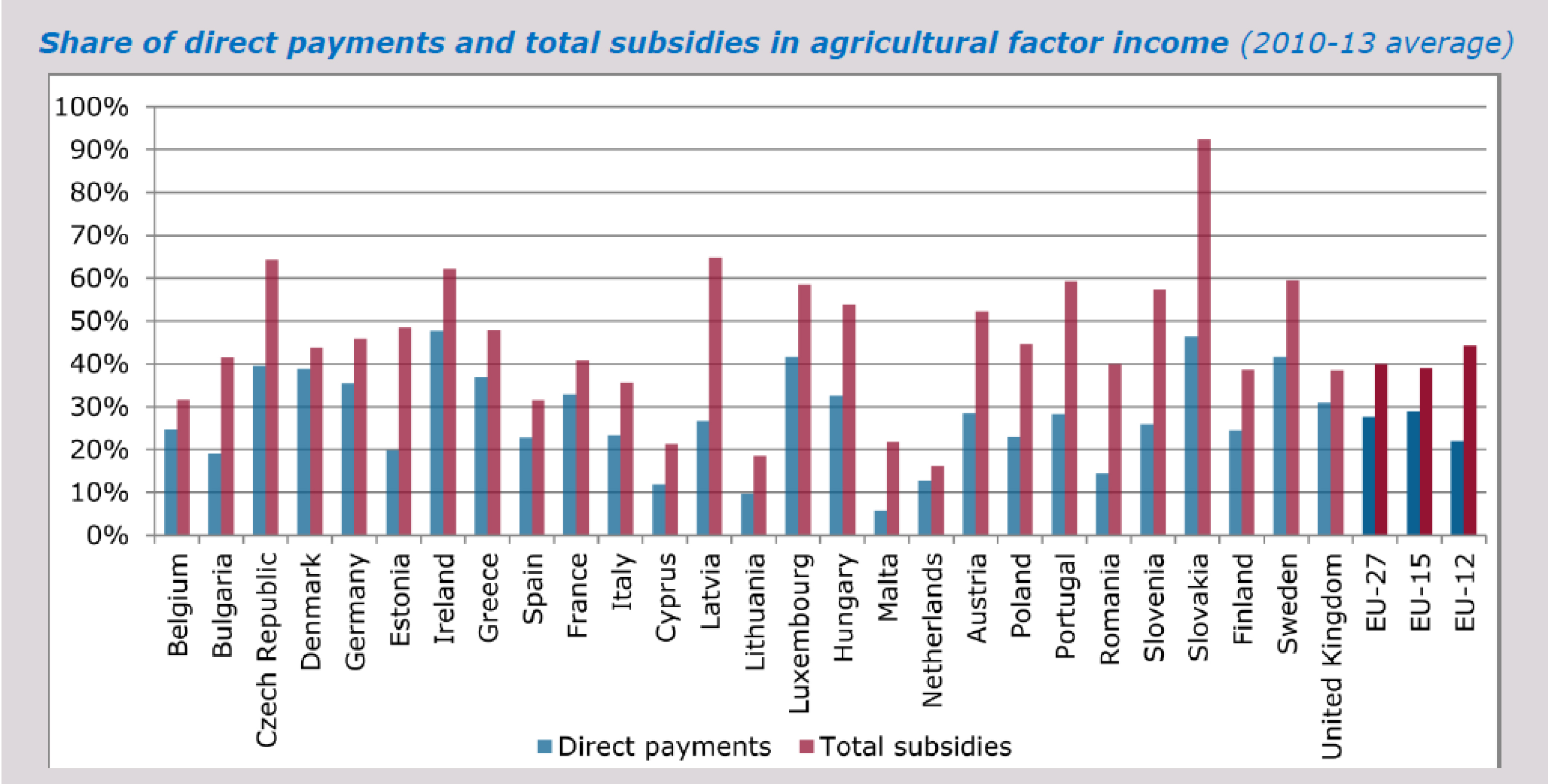 Del análisis que hace la Comisión se desprende que, en general, los agricultores y ganaderos de la UE tienen una alta dependencia de los apoyos públicos aportados por la PAC, procedentes tanto de los pagos directos como de las ayudas al desarrollo rural. En la media de los años estudiados, en el conjunto de la UE-28, las ayudas PAC representaron un 37 % de los ingresos agrarios. Ciñendo el cálculo a los pagos directos, el porcentaje estaría en el 27%.