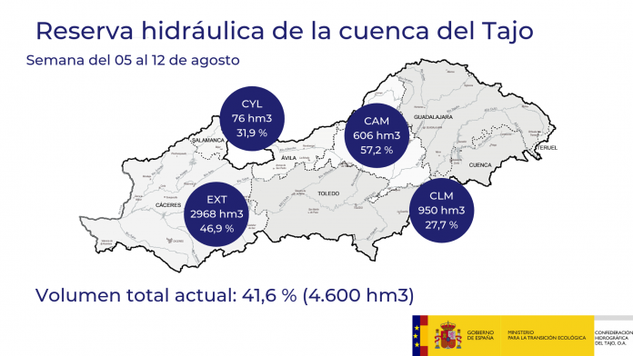 La reserva hidráulica de la cuenca del Tajo almacena 4.600 hectómetros cúbicos esta semana, lo que supone un 41,6% de su capacidad total, según datos validados por la Confederación Hidrográfica del Tajo, organismo autónomo del Ministerio para la Transición Ecológica.