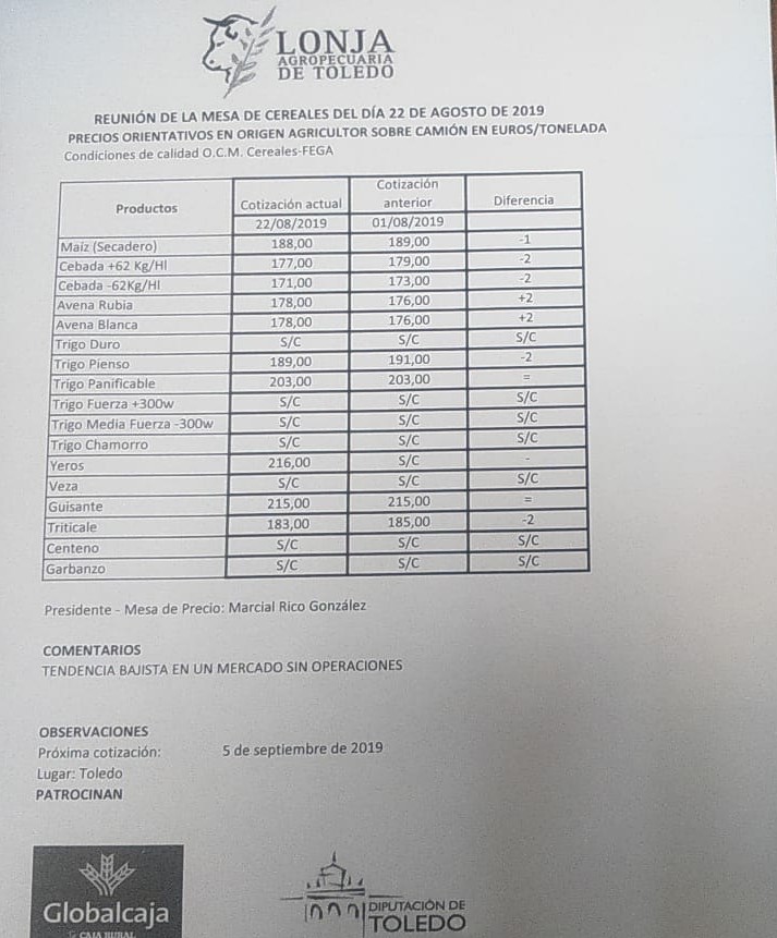 Lonja Agropecuaria de Toledo. Cereales. 22-agosto-2019