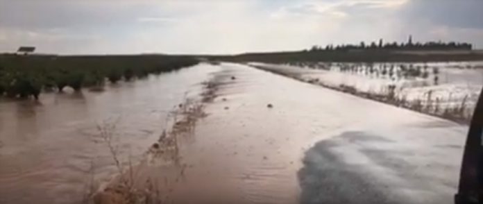 La lluvia anega un camino entre viñedos, en Valdepeñas