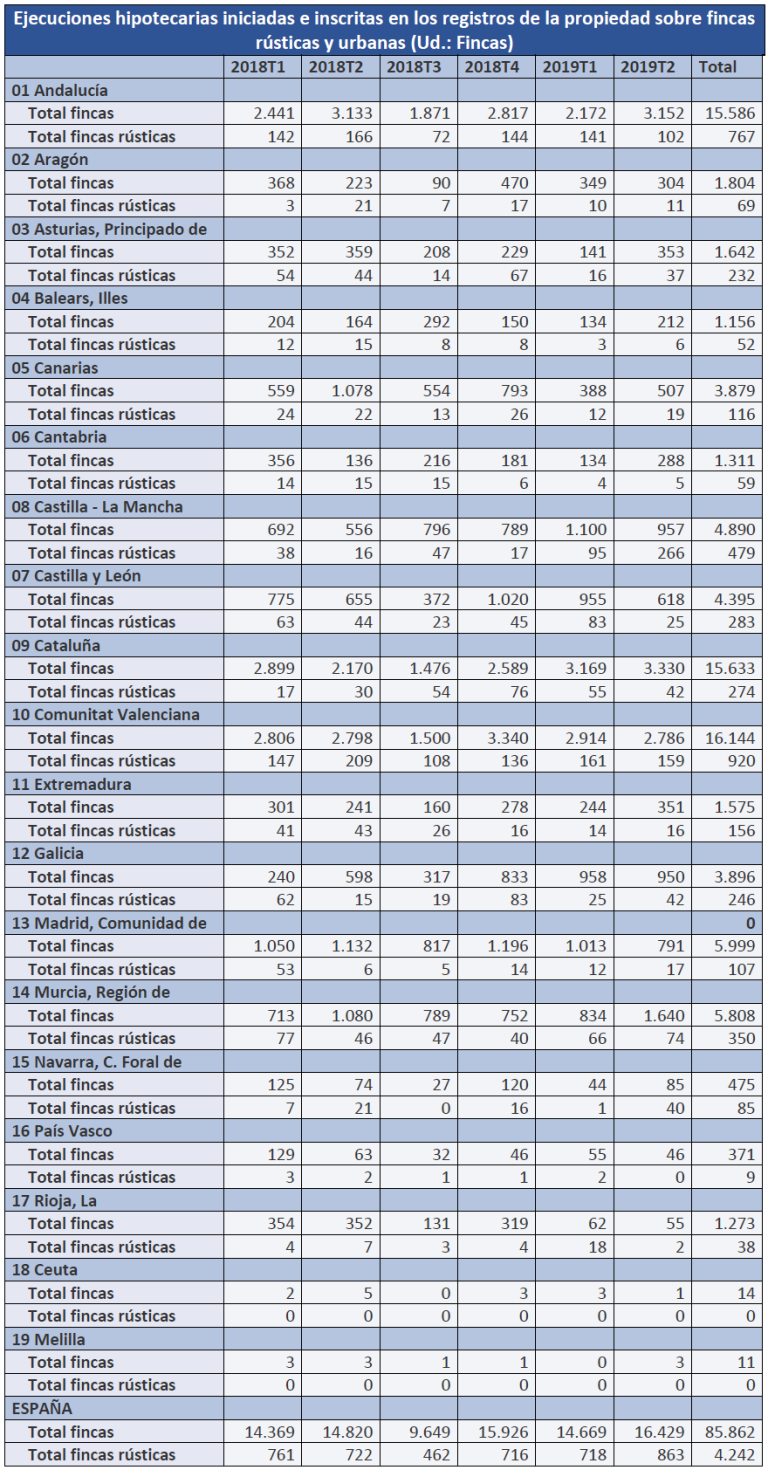 Entre 2018 y el primer semestre de 2019 se han iniciado 4.242 ejecuciones hipotecarias de fincas rústicas en España, según los datos más recientes del Instituto Nacional de Estadísticas, analizados por Unión de Uniones. Esta cifra supone un 5 % de las inscripciones de certificaciones por ejecución hipotecaria que se inician en los registros de la propiedad. Este porcentaje, se mantiene bastante estable también en años anteriores, independientemente de que en regiones como Asturias, Castilla-La Mancha, Extremadura o Navarra, hay comparativamente una mayor proporción de ejecuciones sobre fincas rústicas.