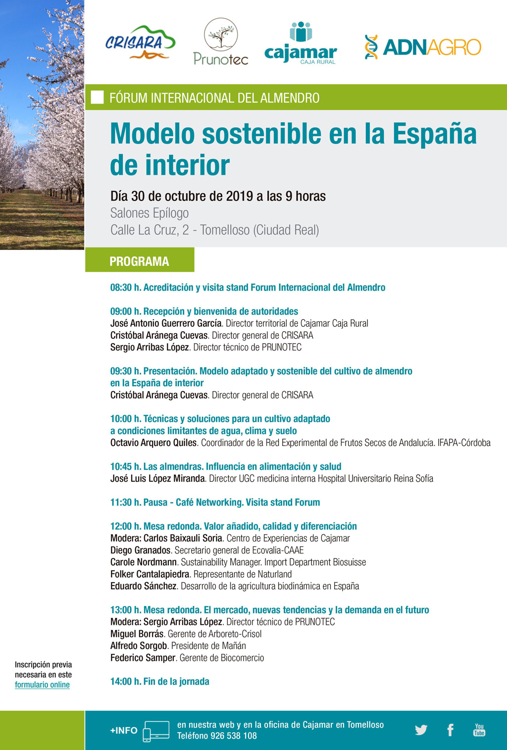 Tomelloso acogerá el próximo 30 de octubre el I Forum Internacional del Almendro en España, organizado por Prunotec, Crisara y Cajamar. La cita será en Salones Epílogo de 08:30 a 14:00 horas.