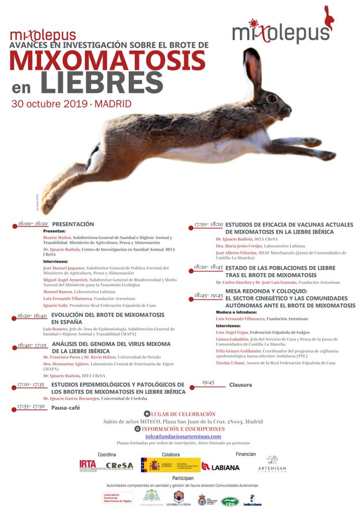 El próximo 30 de octubre, la Real Federación Española de Caza, junto al Ministerio de Agricultura, Pesca y Alimentación, la Fundación Artemisan y otras entidades competentes en sanidad y gestión de fauna silvestre, presentarán en Madrid los avances en investigación sobre el brote de mixomatosis en liebres en España.