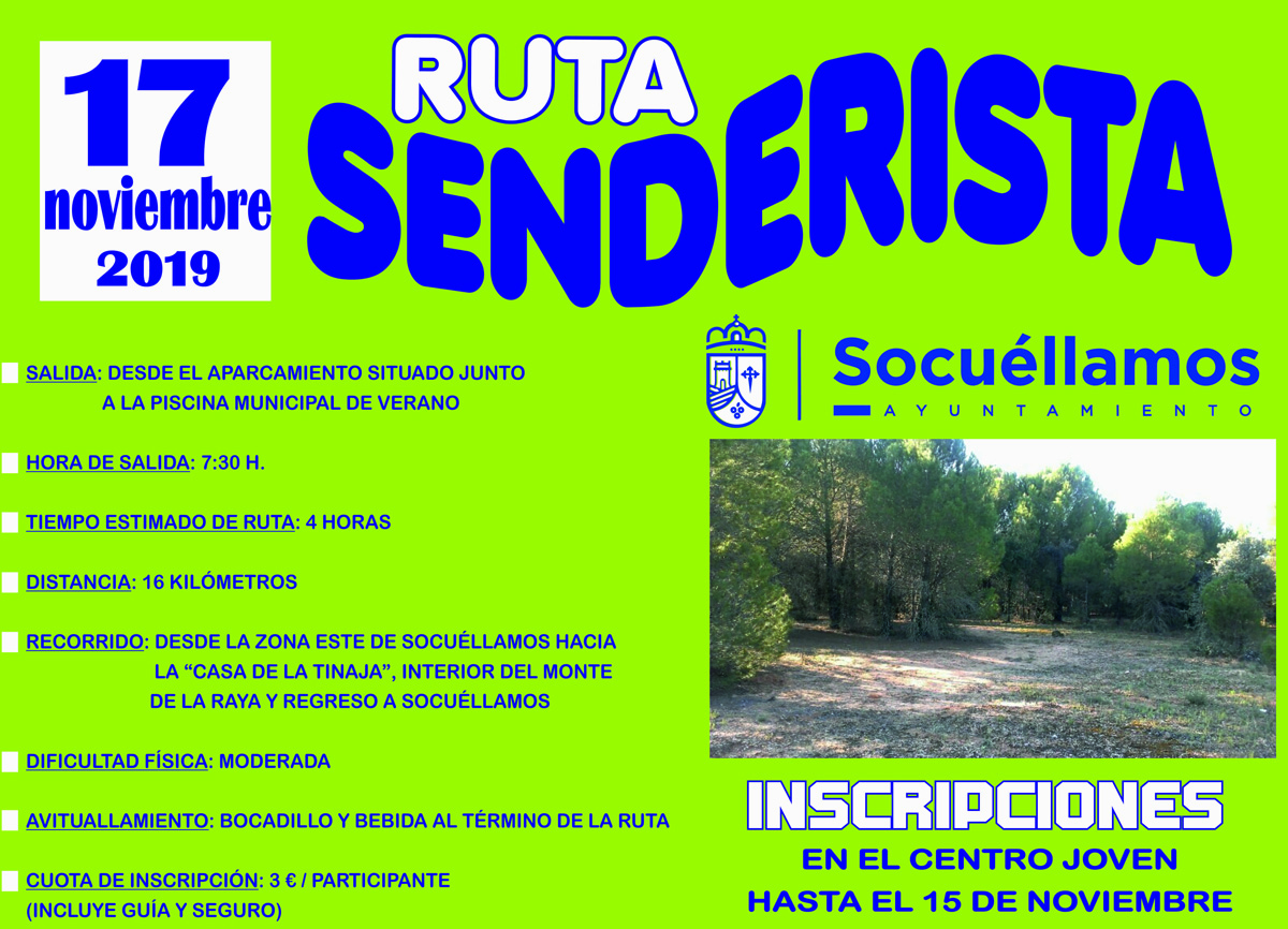 La primera ruta de este proyecto se celebrará el próximo 17 de noviembre y partirá del aparcamiento de la piscina de verano a las 7:30. Recorrerá una distancia de 16 kilómetros, la dificultad es moderada y se estima que dure unas 4 horas. La ruta discurrirá por el este de Socuéllamos hasta la conocida como Casa de la Tinaja, adentrándose en el “Monte de la Raya” para regresar a la localidad.