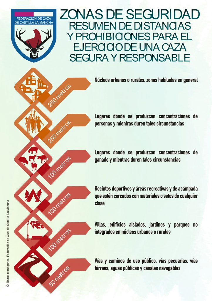 A los cazadores también se les recuerda cuáles son las zonas de seguridad, como vías y caminos de uso público, senderos de uso público señalizados, vías pecuarias, vías férreas, dominio público hidráulico, sus márgenes y su zona de servidumbre, canales navegables, áreas de uso público, áreas recreativas y de acampada, núcleos urbanos, industriales y edificables.