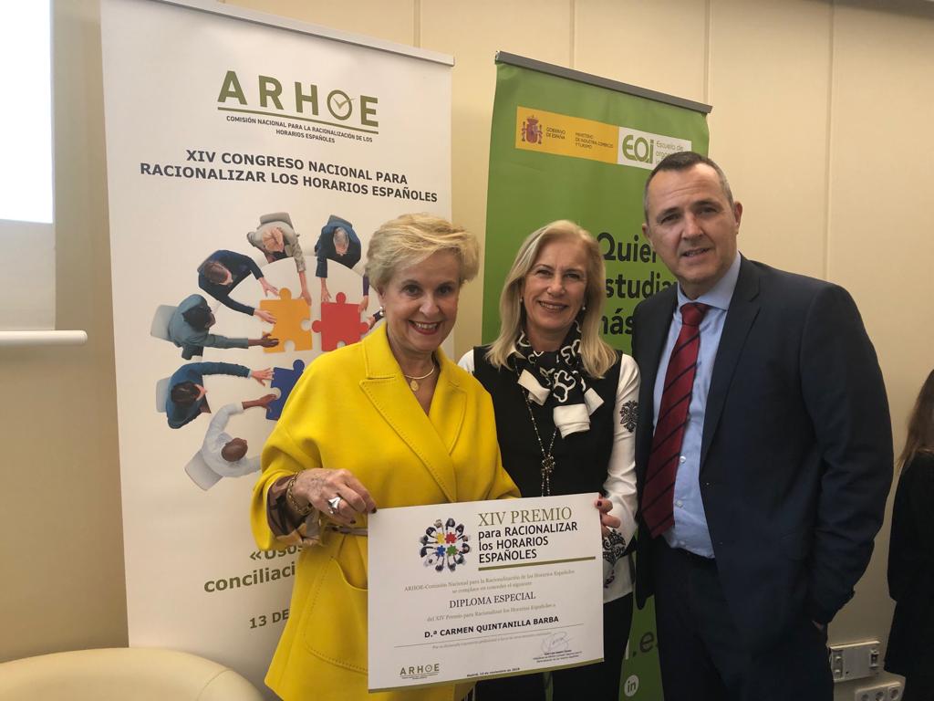 En el marco del XIV Congreso Nacional para Racionalizar los Horarios Españoles («Usos del tiempo, conciliación y productividad») que ha tenido lugar en la Escuela de Organización Industrial, ha sido reconocida la presidenta de AFAMMER, Carmen Quintanilla, por su inestimable trabajo para hacer que esta realidad sea posible; un reconocimiento que también ha sido otorgado al catedrático de la Universidad Complutense de Madrid, Julio Iglesias de Ussel.