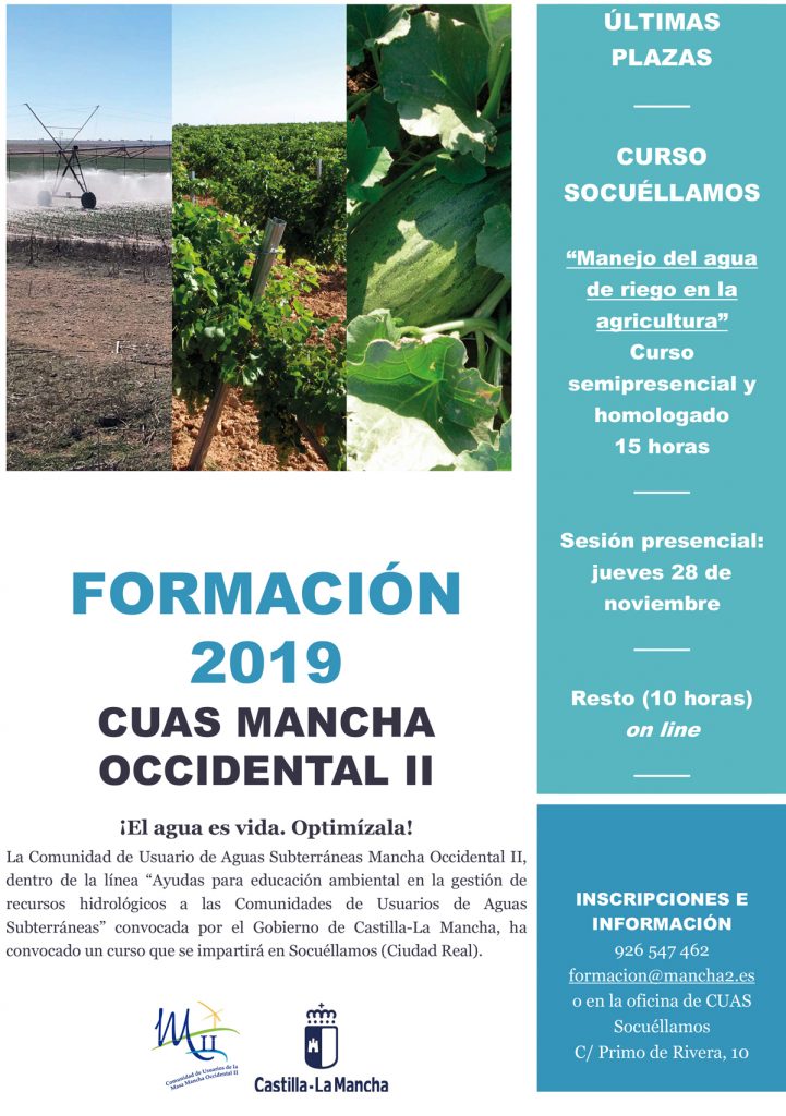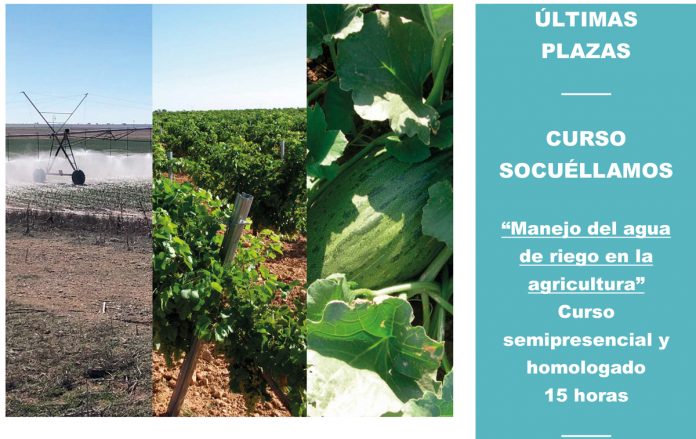 La Comunidad de Usuarios de Aguas Subterráneas (CUAS) de Mancha Occidental II impartirá en Socuéllamos (Ciudad Real) un curso sobre manejo del agua de riego en agricultura. Se trata de una acción formativa con una duración de 15 horas y en modalidad semipresencial, teniendo lugar la sesión inicial y presencial el jueves 28 de noviembre de 16:00 a 21:00 horas en la Torre del Vino de la localidad manchega. El resto del temario, 10 horas, se impartirá en modalidad on line, es decir, a través de ordenador u otro dispositivo informático.