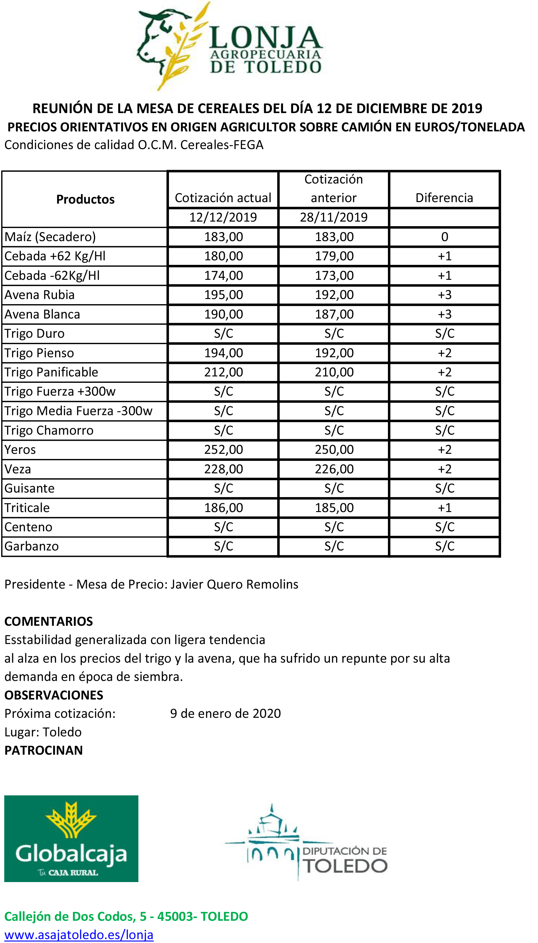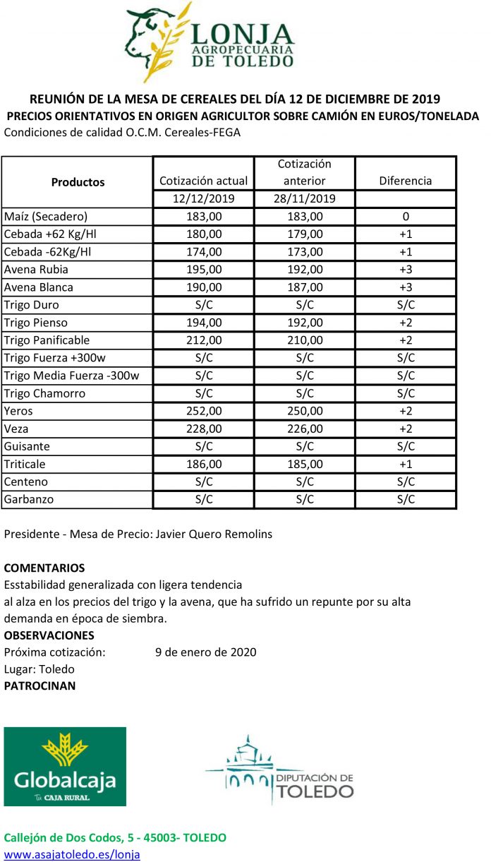 Lonja Agropecuaria de Toledo. Cereales. 12-diciembre-2019