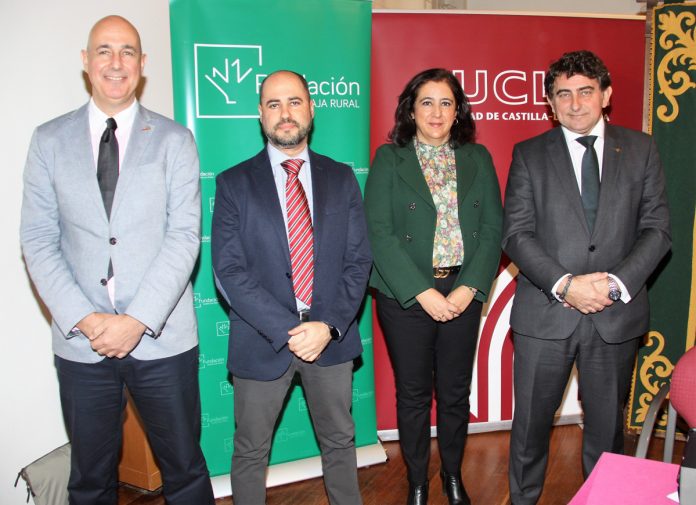 El gerente de la Fundación Eurocaja Rural, Vicente Muñoz Almagro, la vicerrectora de Internacionalización y Formación Permanente de la Universidad de Castilla-La Mancha (UCLM), Fátima Guadamillas, y el profesor Mario Donate, acompañados por el director de la División de Relaciones Institucionales de Eurocaja Rural, Miguel Ángel Escalante Pinel, han presentado esta mañana en la Facultad de Ciencias Jurídicas y Sociales de la UCLM en Toledo los resultados del Termómetro Económico de Castilla-La Mancha correspondiente al tercer trimestre de 2019.