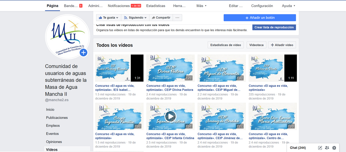 Los ocho vídeos presentados al I Concurso Escolar ‘El agua es vida. Optimízala’, organizado por la Comunidad de Usuarios de Aguas Subterráneas (CUAS) de Mancha Occidental II, están alcanzando unas cifras “espectaculares” de participación en el perfil de Facebook (https://www.facebook.com/mancha2.es/) donde están publicados los trabajos.