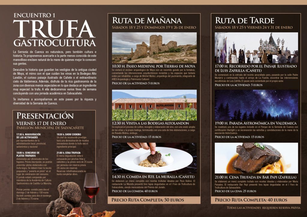 Salvacañete acogerá el viernes 17 de enero la inauguración del primer encuentro ‘Trufa Gastrocultura’ , organizado por el Ayuntamiento de la localidad conquense y la Asociación Interprofesional de Truficultura y Actividades Turísticas relacionadas de Salvacañete y la colaboración de los ayuntamientos de Cañete, Moya y Valdemeca.