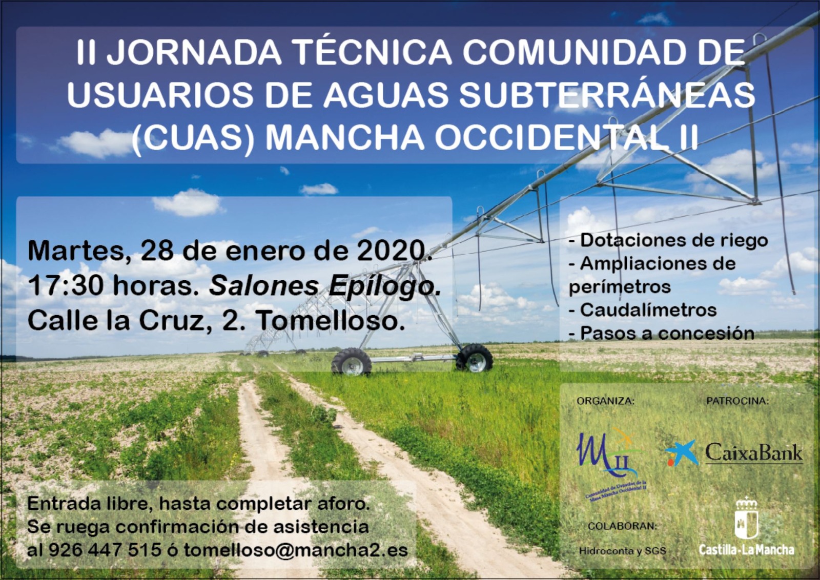 La Comunidad de Usuarios de Aguas Subterráneas (CUAS) de la Masa Mancha Occidental II celebrará su II Jornada Técnica sobre Aguas Subterráneas el próximo martes 28 de enero en Tomelloso (Ciudad Real). Será a partir de las 17:30 horas en Salones Epílogo, en la calle de la Cruz, 2.