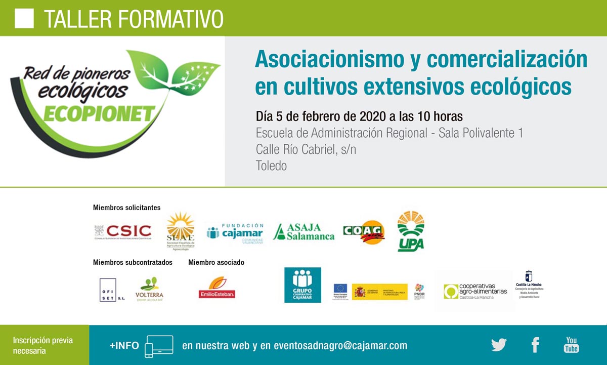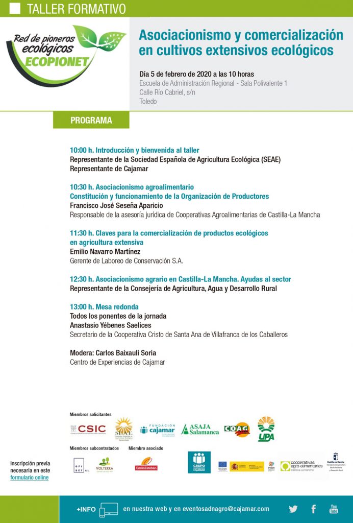 La jornada comenzará con la intervención de un representante de la Sociedad Española de Agricultura Ecológica (SEAE) y posteriormente Francisco José Seseña, responsable de la asesoría jurídica de Cooperativas Agro-alimentarias Castilla-La Mancha abordará el asociacionismo agroalimentario y la constitución y funcionamiento de la Organización de Productores.