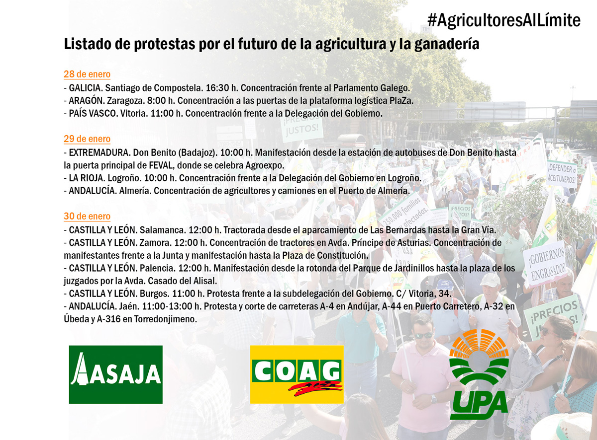 “En defensa de su futuro” los agricultores y ganaderos de toda España, convocados por ASAJA, COAG y UPA, inician mañana martes, 28 de enero, la primera oleada de movilizaciones para denunciar «la grave situación de falta de rentabilidad que atraviesan sus explotaciones y el hartazgo ante los ataques que están recibiendo». Galicia, Aragón y País Vasco serán los primeros escenarios de las protestas de mañana. El miércoles, las concentraciones y manifestaciones tendrán lugar en La Rioja y Extremadura y el jueves se sumarán Andalucía y Castilla y León. En la primera quincena de febrero saldrán a la calle los agricultores y ganaderos de Cantabria, Castilla-La Mancha, Madrid y Murcia