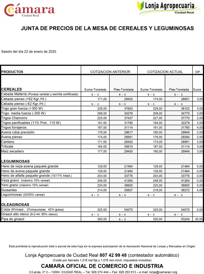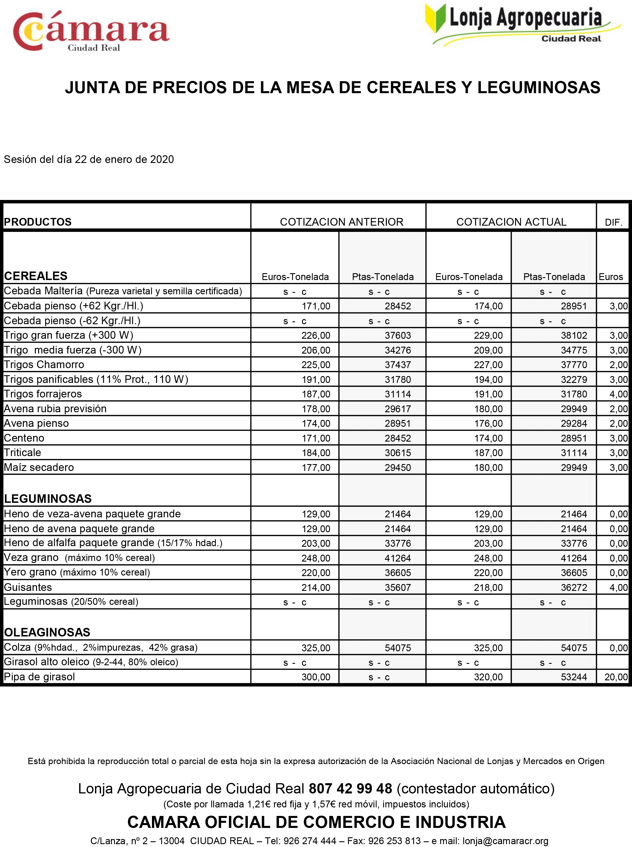 Lonja de Ciudad Real. Cereales. 22-enero-2020