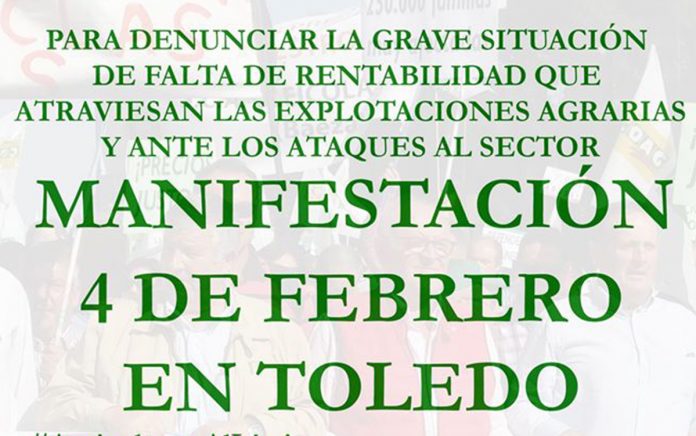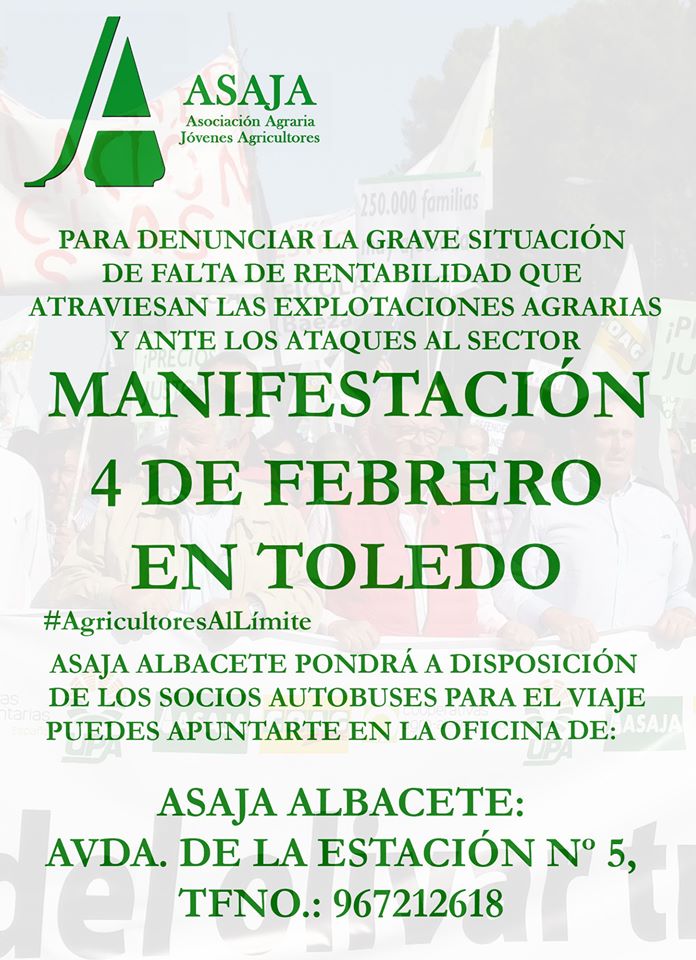 La Asociación Agraria-Jóvenes Agricultores (ASAJA) de Albacete saldrá a la calle el próximo martes 4 de febrero en Toledo para protestar por la grave crisis que asola el sector agrícola y ganadero. Las movilizaciones comenzarán a las 11:00 horas desde la plaza de toros de la capital toledana para finalizar en la Plaza de Zocodover, donde se leerá un comunicado con las reivindicaciones a las autoridades.