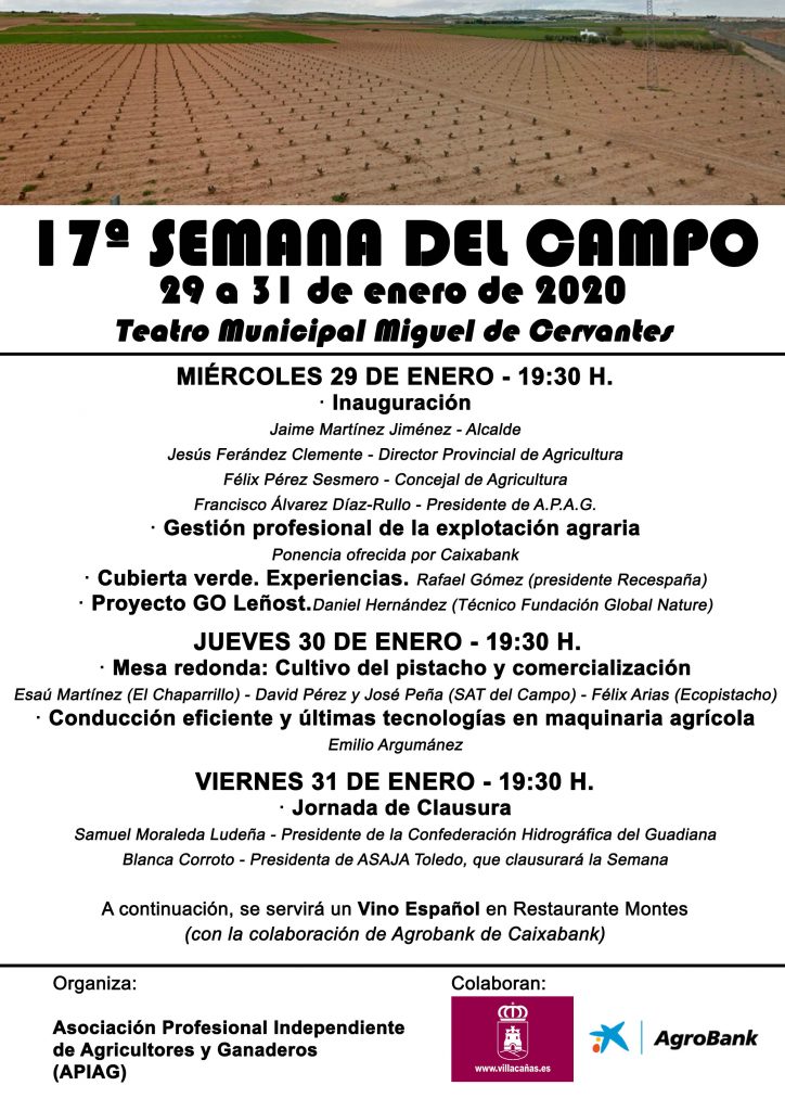 Los agricultores de Villacañas (Toledo) celebran estos días su 17ª Semana del Campo que, organizada por la Asociación Profesional de Agricultores y Ganaderos (APAG), en colaboración con el Ayuntamiento, se compone de varias charlas sobre asuntos agrarios de actualidad e interés.