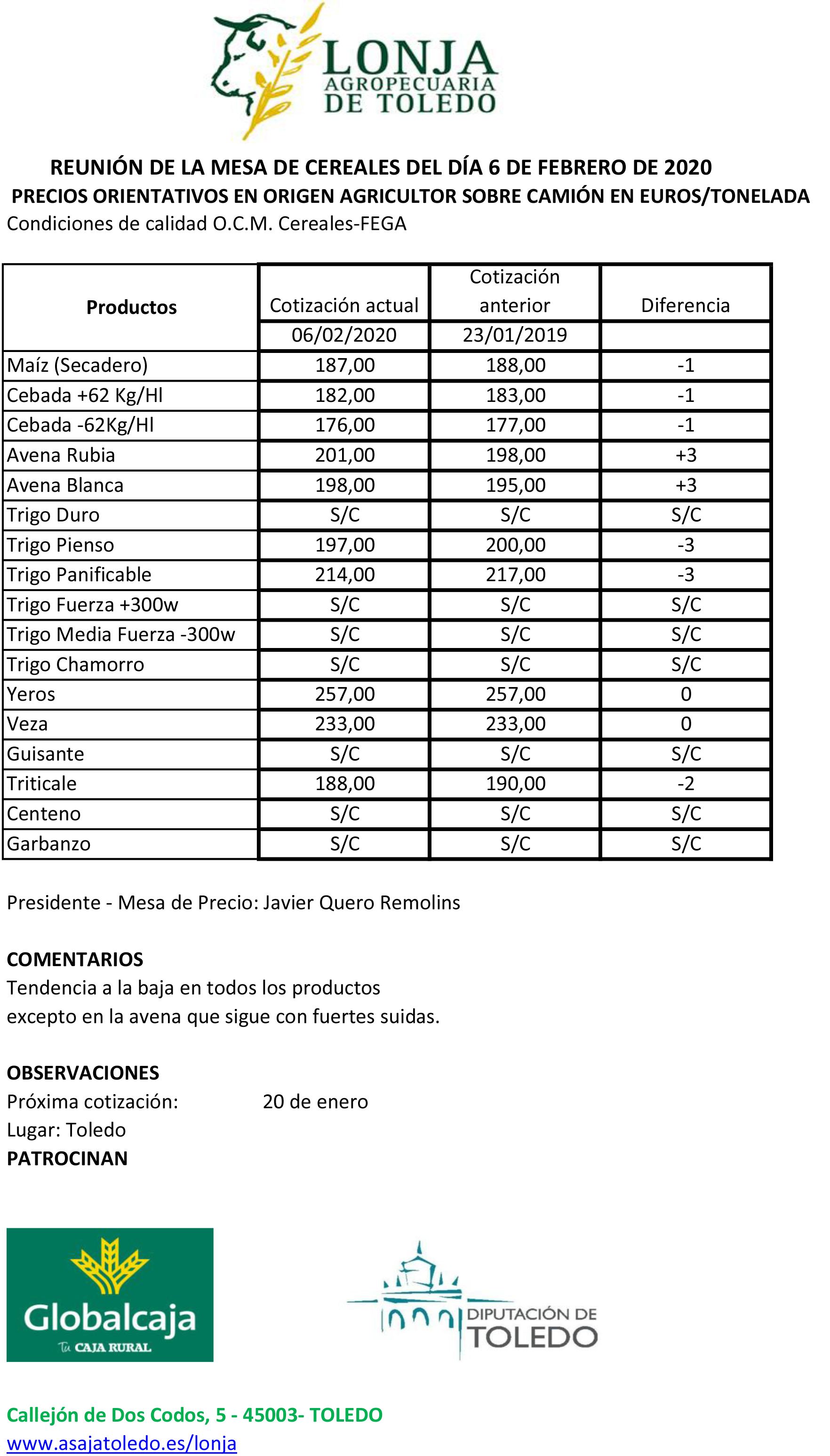 Lonja Agropecuaria de Toledo. Cereales. 6-febrero-2020