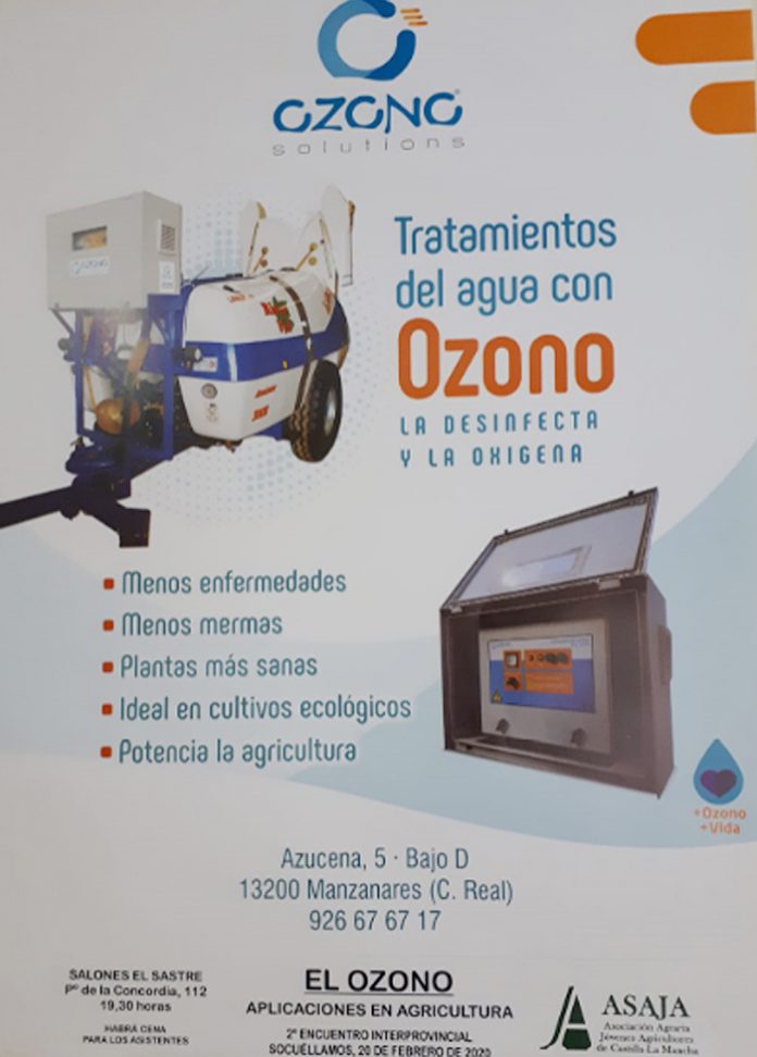 La empresa Ozono Solutions, en colaboración con la organización agraria ASAJA Castilla-La Mancha, va a organizar el 2º Encuentro Interprovincial sobre ‘El ozono, aplicaciones en la agricultura’, que tendrá lugar el jueves 20 de febrero a las 19:30 horas en Salones El Sastre (Paseo de la Concordia, 112) de Socuéllamos (Ciudad Real).