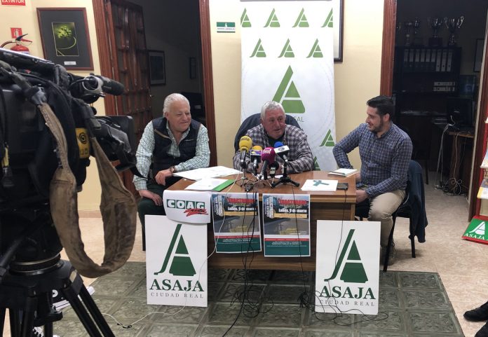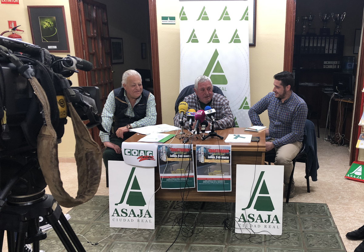 El presidente de ASAJA Castilla-La Mancha Fernando Villena, junto con Pedro Alcolea y Sergio Parra, en representación de ASAJA Ciudad Real y COAG, respectivamente, han hecho un llamamiento este jueves, en Tomelloso (Ciudad Real), al sector agrario y a toda la sociedad, para que se impliquen, apoyen y participen en las movilizaciones que las dos organizaciones agrarias han convocado, junto con UPA, para el próximo lunes, 9 de marzo, a partir de las 9:30 horas en varios puntos de la provincia de Ciudad Real, concretamente en la Autovía de Andalucía (A-IV, a la altura de Valdepeñas y Manzanares y en la Autovía de Los Viñedos (CM-42) en Tomelloso, en el tramo comprendido entre la rotonda de acceso desde la carretera de Socuéllamos y la de Pedro Muñoz, así como en la estación de Renfe de Socuéllamos, donde tienen previsto concentrarse y parar el tráfico ferroviario.