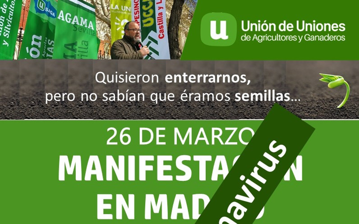 Unión de Uniones se ha dirigido este viernes por escrito a la Delegación del Gobierno en Madrid para comunicar el aplazamiento de la manifestación prevista para el próximo jueves 26 de marzo frente el Ministerio de Agricultura, en Atocha, ante la ausencia de instrucciones y recomendaciones claras y por escrito hasta la fecha, para garantizar la integridad sanitaria de los asistentes en el actual escenario de coronavirus.