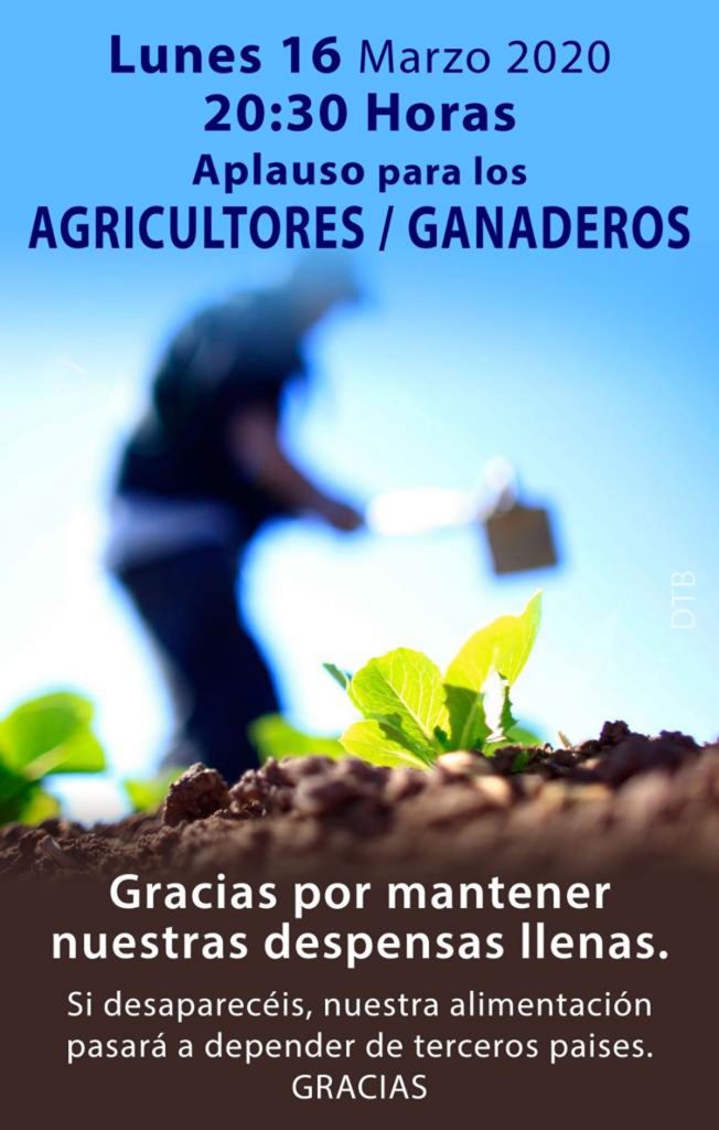 En varios grupos de whatsapp se está compartiendo una convocatoria ciudadana para aplaudir desde los domicilios particulares a los agricultores y ganaderos agradeciéndoles “mantener nuestras despensas llenas” y recogiendo que “si desaparecéis, nuestra alimentación pasará a depender de terceros países”. La convocatoria es para las 20:30 horas de este lunes 16 de marzo.