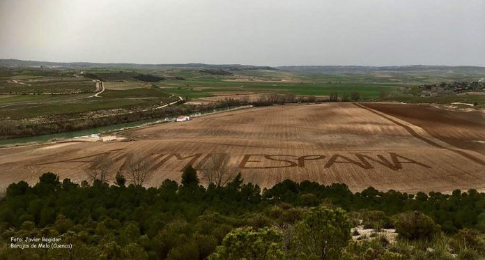 La organización agraria ASAJA Cuenca ha publicado en sus redes sociales una fotografía que está haciendo viral. Se trata de una imagen de Javier Regidor, que desde la localidad conquense de Barajas de Melo ha querido dejar escrito en la tierra un bonito mensaje en el que se puede leer Ánimo España.