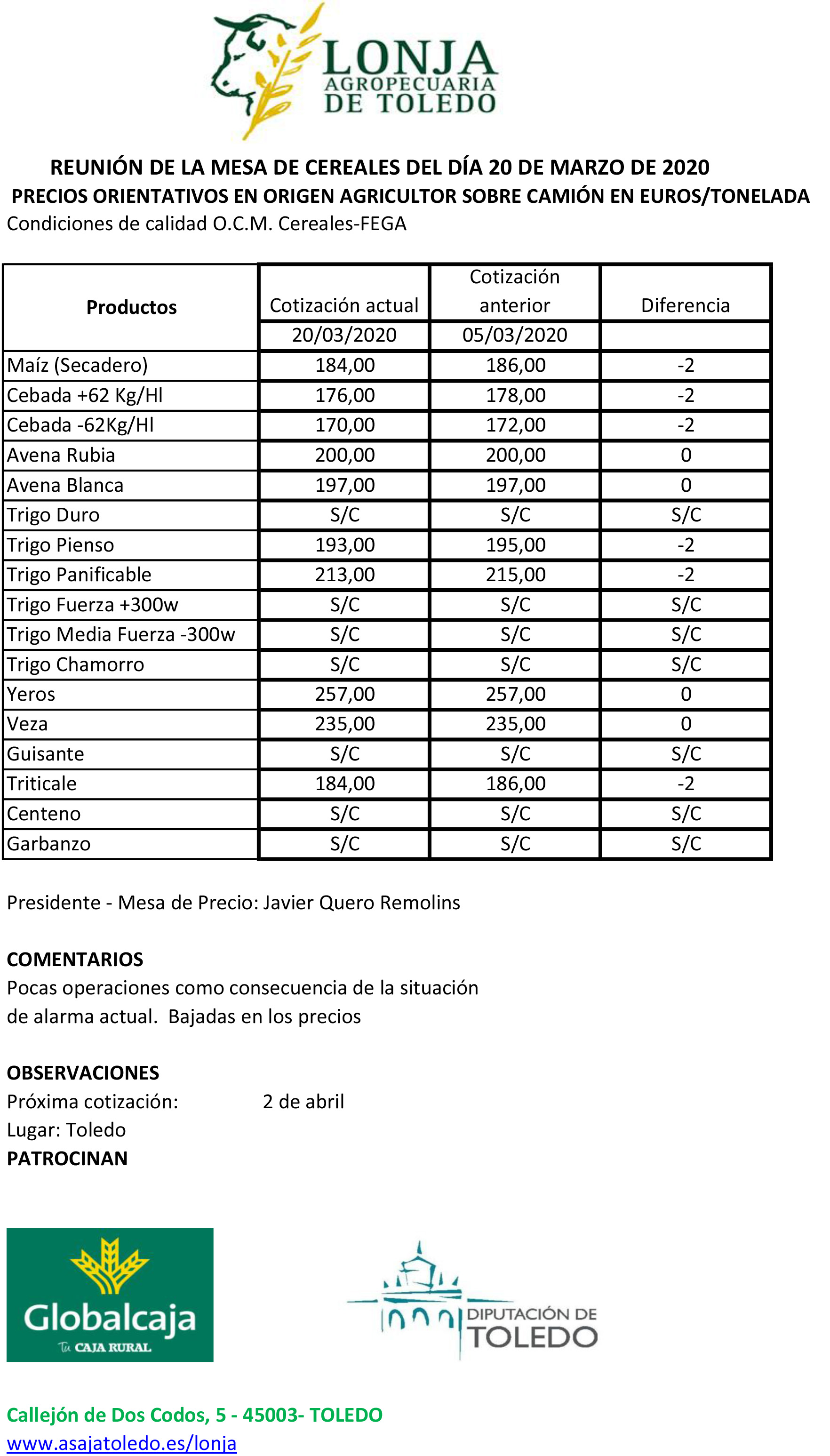 Lonja Agropecuaria de Toledo. Cereales. 20-marzo-2020