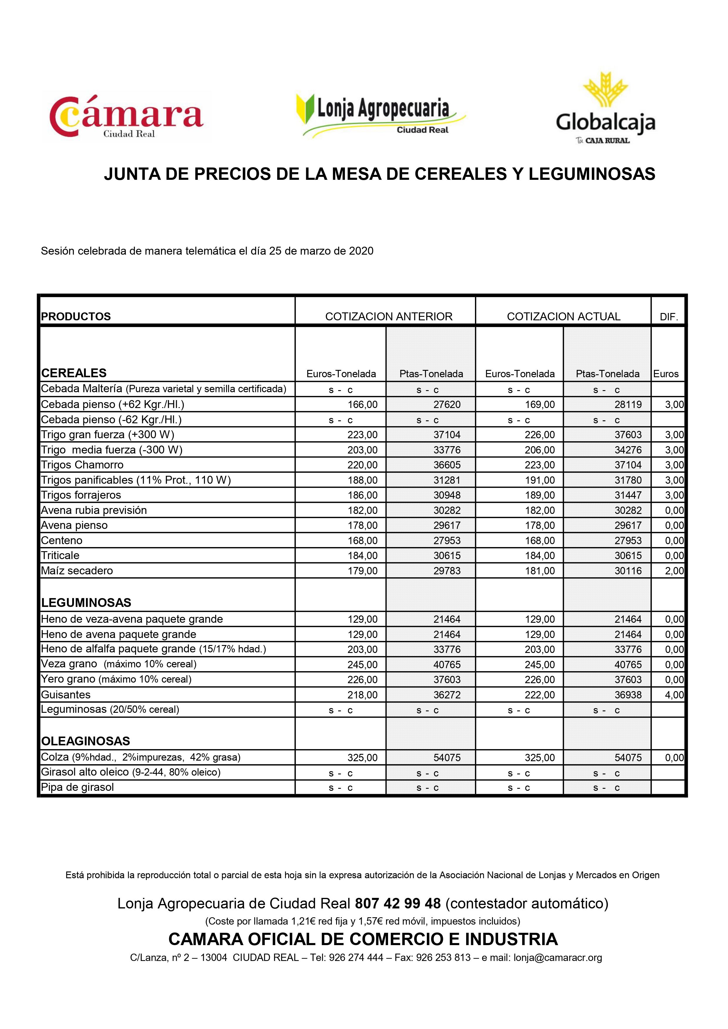 Lonja Agropecuaria de Ciudad Real. Mesa de Cereales y Leguminosas. 25-marzo-2020