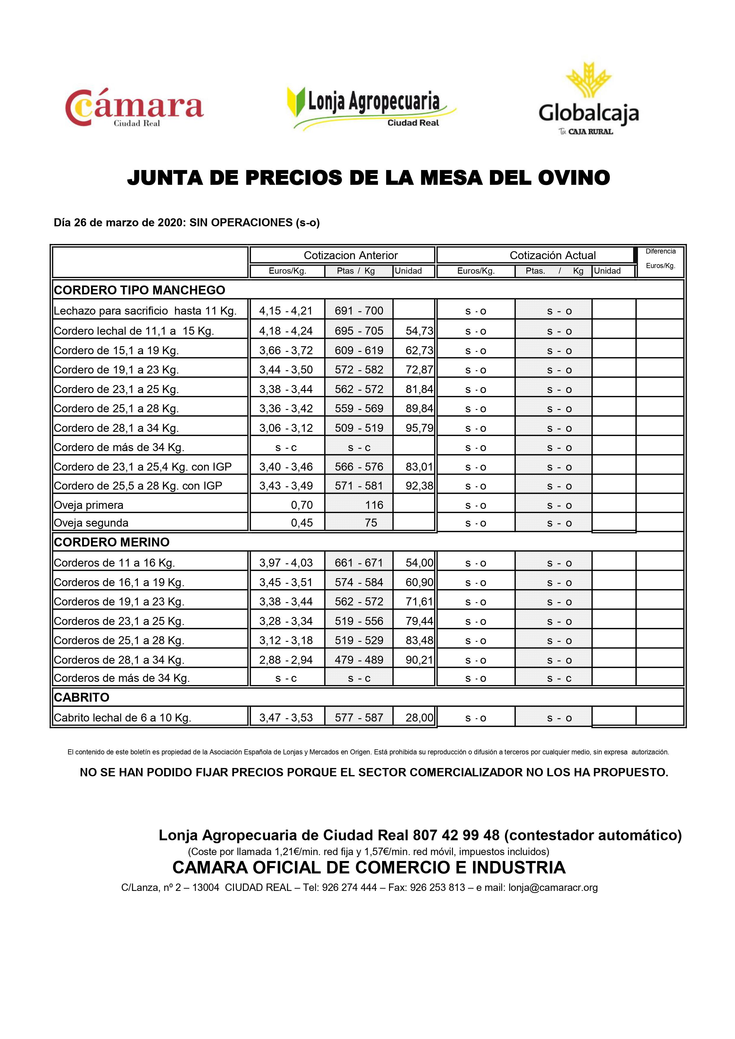 Lonja Agropecuaria de Ciudad Real. Mesa del Ovino. 26 de marzo de 2020: SIN OPERACIONES