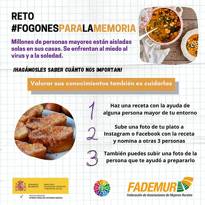 La organización de mujeres rurales FADEMUR ha lanzado este viernes Fogones para la Memoria, un desafío en cadena en el que los participantes tienen que reproducir recetas culinarias ayudados por las personas mayores de su entorno.