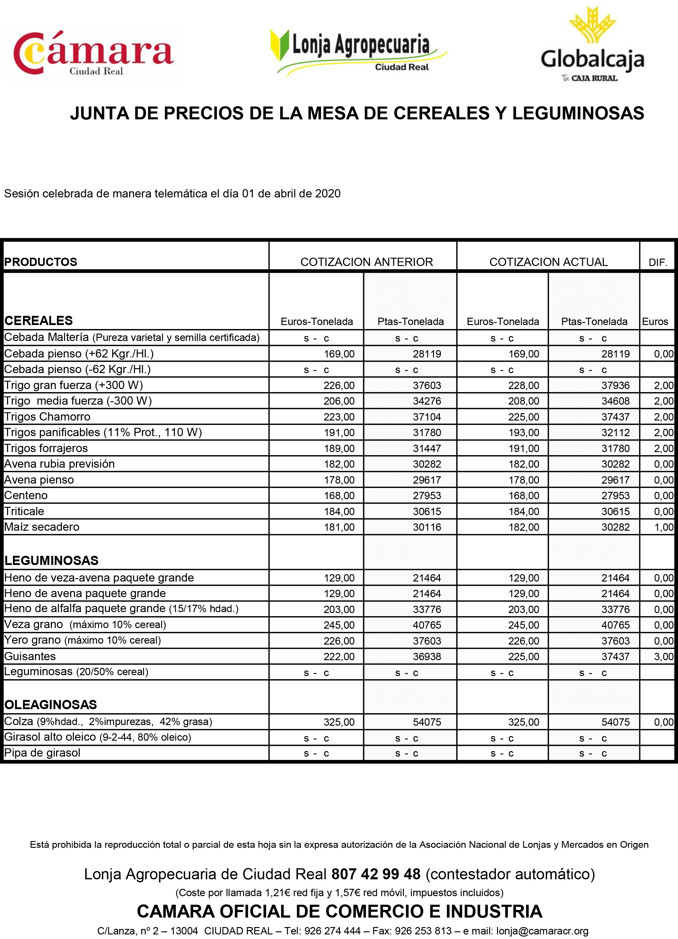 Lonja de Ciudad Real. Cereales y leguminosas. 1-abril-2020