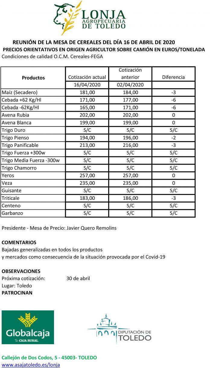 Lonja Agropecuaria de Toledo. Cereales. 16-abril-2020