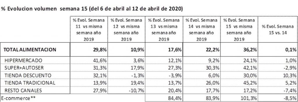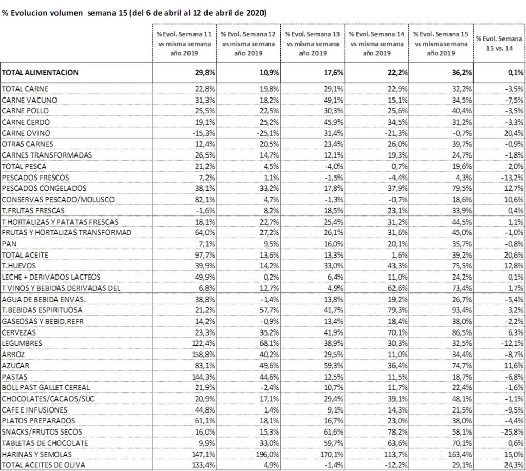 Los hogares españoles han estabilizado sus compras de alimentos la semana del 6 al 12 de abril, según se desprende de los datos del Análisis de consumo en el hogar, del Ministerio de Agricultura, Pesca y Alimentación. En esta cuarta semana tras la declaración del estado de alarma, el volumen de compra de alimentos apenas se incrementa un 0,1 % en la semana 15 del año con respecto a la semana anterior, aunque experimenta una subida del 36,2 % en relación a la misma semana de 2019.