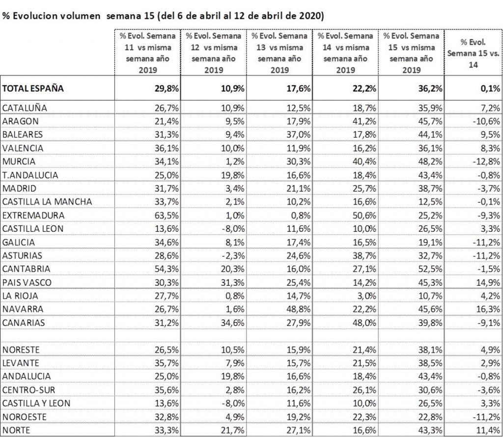 Por zonas geográficas, esta semana se observa mayor incremento del consumo en la zona norte, con subidas del 52,5 % en Cantabria, 45,6 % en Navarra y 45,3 % en el País Vasco. Las comunidades con crecimientos más contenidos son La Rioja (+10,7 %), Castilla-La Mancha (+12,5 %) y Galicia (+19,1 %). Canarias presenta crecimientos constantes semana a semana.