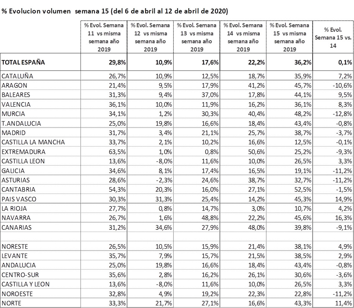 Por zonas geográficas, esta semana se observa mayor incremento del consumo en la zona norte, con subidas del 52,5 % en Cantabria, 45,6 % en Navarra y 45,3 % en el País Vasco. Las comunidades con crecimientos más contenidos son La Rioja (+10,7 %), Castilla-La Mancha (+12,5 %) y Galicia (+19,1 %). Canarias presenta crecimientos constantes semana a semana.
