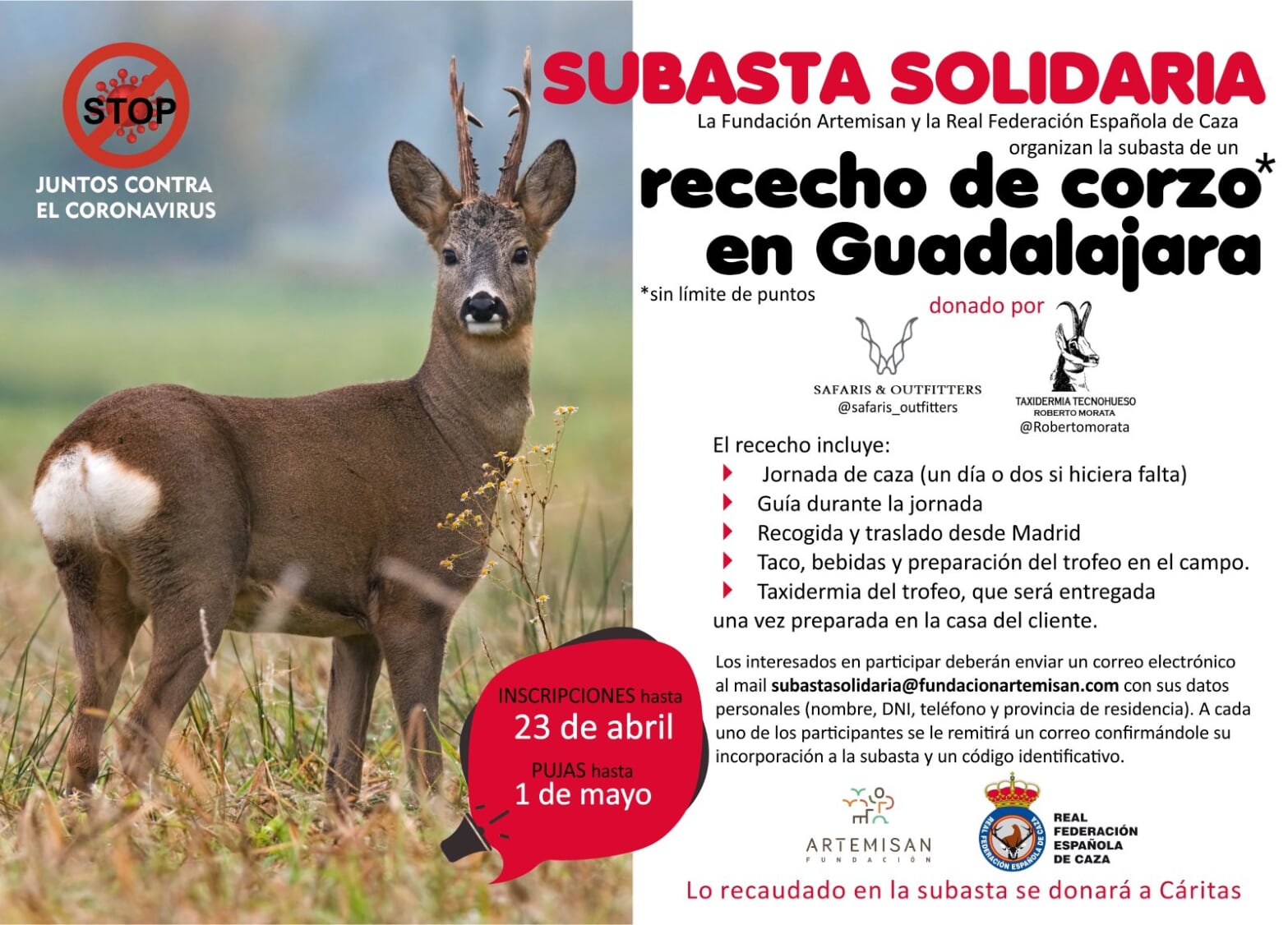 La Fundación Artemisan ha lanzado una subasta solidaria en la que aquellas personas que lo deseen podrán pujar por un rececho de corzo en Guadalajara, que ha sido donado por las empresas Safaris&Outfitters y Roberto Morata Taxidermia. La recaudación que se obtenga en la puja se destinará íntegramente a la campaña solidaria lanzada por la Fundación Artemisan y por la Real Federación Española de Caza a beneficio de Cáritas.