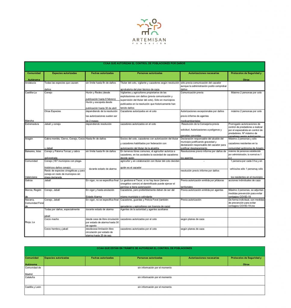 Ante la gran disparidad de criterios y normativas surgidas tras la recomendación del Gobierno a las Comunidades Autónomas de realizar control de poblaciones de algunas especies por estar causando daños en las explotaciones agrarias del país durante el estado de alarma, Fundación Artemisan ha elaborado este cuadro resumen de la situación en los diferentes territorios.