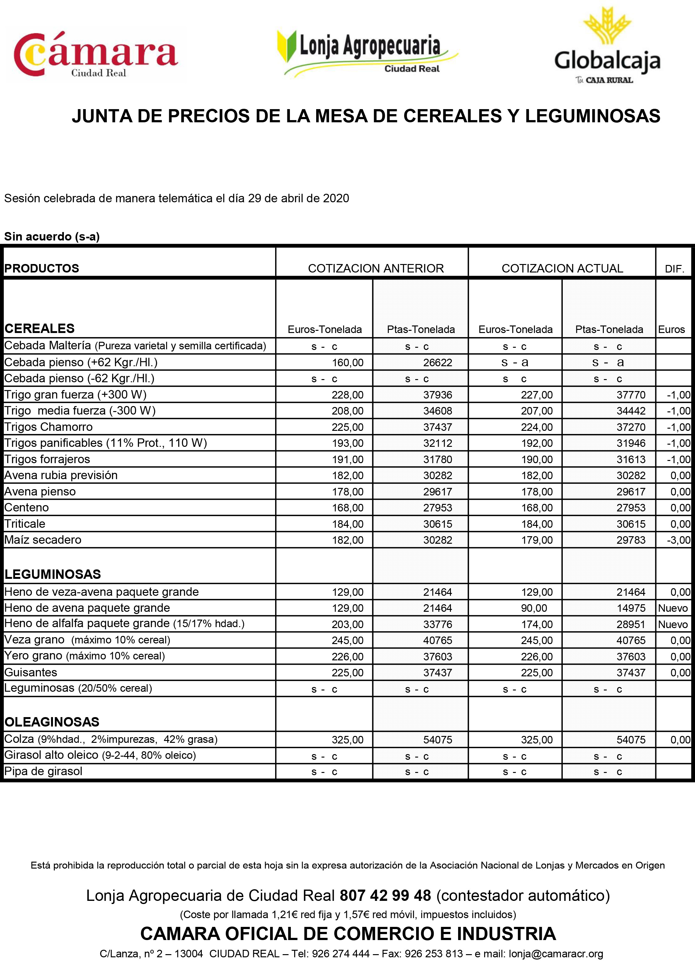 Lonja de Ciudad Real. Cereales. 29-abril-2020