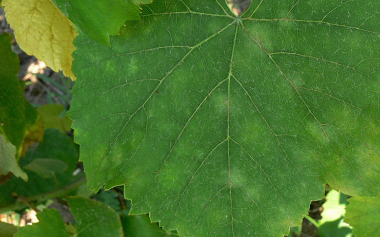 Este hongo puede atacar a todos los órganos verdes de la vid. En las hojas los síntomas pueden aparecer tanto en el haz como en el envés, observándose un polvillo blanco-ceniciento. A veces, los comienzos del ataque se pueden manifestar como manchas de aceite, que recuerdan a las del “mildiu”, pero que suelen ser más pequeñas y nunca muestran la típica pelusilla blanca en el envés.