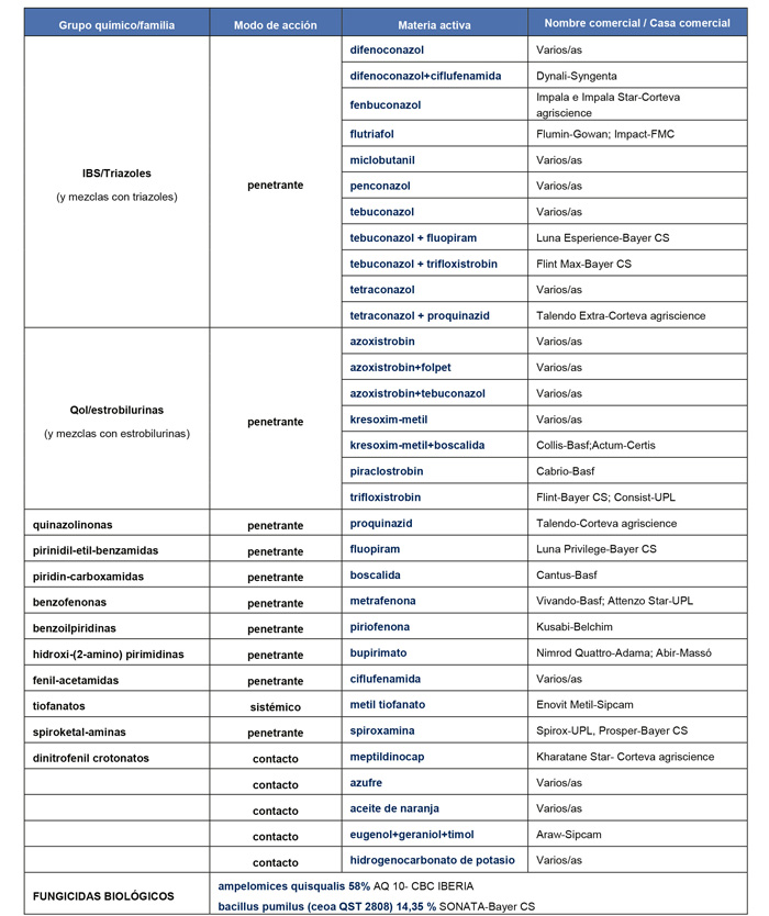 A continuación, se muestra tabla con los productos autorizados contra oídio, modo de acción y grupo químico/familia a la que pertenece.