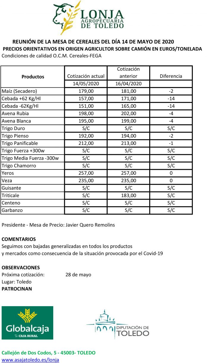 Lonja Agropecuaria de Toledo. Cereales. 14-mayo-2020