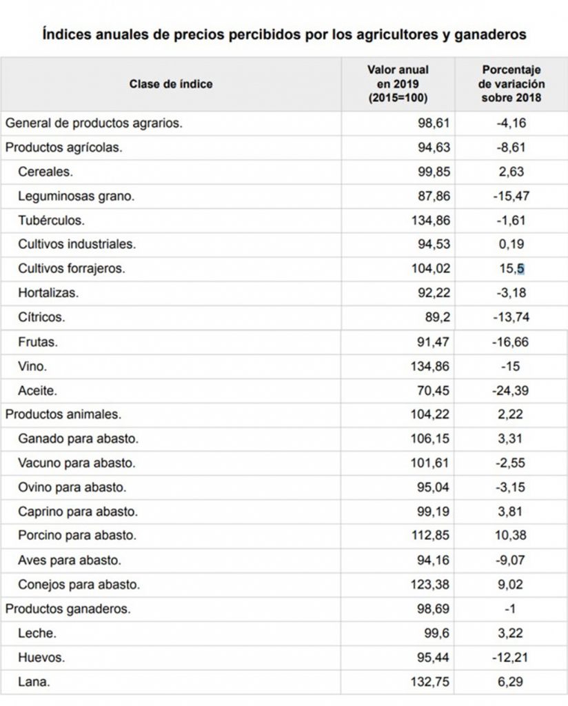 Para el año 2019 el índice general habría bajado, con los datos del Ministerio en la mano, un -4,16 %, diferenciando en una bajada del -8,81% para los productos agrícolas, un aumento del +2,22% para los productos animales (carnes de abasto) y un recorte del -1,9% para los productos ganaderos (leche, huevos, lana). Además, publica también cómo han evolucionado los índices de precios producto por producto, marcando los descensos más importantes para aceite, vino, frutas o leguminosas en los sectores agrícolas y para la avicultura, tanto de carne como de puesta, en la ganadería. Por su parte, los aumentos mayores serían para cultivos forrajeros y carne de porcino y de conejo.