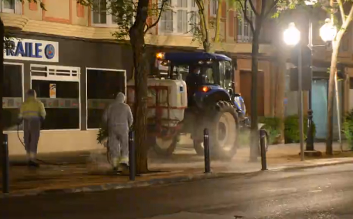 Las primeras desinfecciones programadas desde el Ayuntamiento en medio de la crisis sanitaria originada por el COVID-10 se realizaban a primera hora de la mañana, pero con el inicio del desconfinamiento, en el que se empezó a permitir la salida de los vecinos y vecinas a la calle, estas labores se trasladaron a horario nocturno con el fin de evitar coincidir en los horarios autorizados para el paseo y la realización de deporte. Además por la noche el producto utilizado en la desinfección es más efectivo ya que con la bajada de las temperaturas las microgotas expulsadas en la pulverización se mantienen más tiempo en las superficies higienizadas.