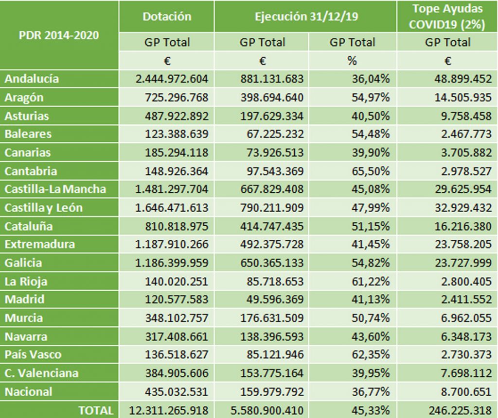 Los PDR de las diferentes comunidades autónomas, junto con el programa nacional gestionado por el propio Ministerio de Agricultura suman un gasto público total previsto de 12.311 millones de euros para España. Por lo tanto, el montante que se podría destinar a ayudas por el COVID se elevaría hasta 246,2 millones de euros.