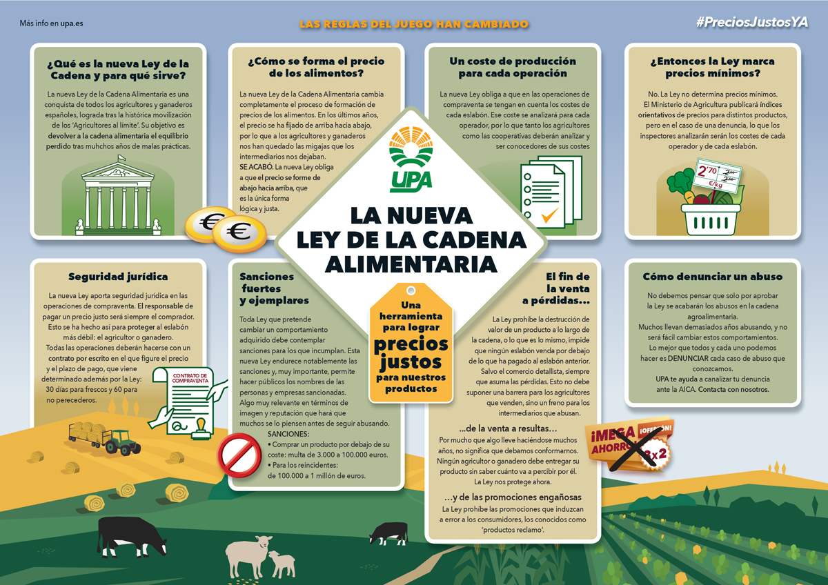 Esa acción se concretó en una modificación de la Ley de la Cadena Alimentaria que en la práctica cambia por completo el funcionamiento de la misma. Para explicar ese cambio, a los agricultores y ganaderos y a toda la sociedad, la Unión de Pequeños Agricultores y Ganaderos ha lanzado hoy una campaña informativa, que desplegará numerosas acciones para dar a conocer la Ley y sus mecanismos.