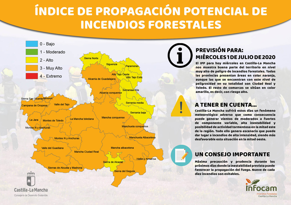 Castilla-La Mancha sufrirá estos días un fenómeno meteorológico adverso que como consecuencia puede generar vientos de moderados a fuertes de componente variable, alta inestabilidad y posibilidad de actividad tormentosa en la mitad este de la región. Todo ello genera escenario que puede dar lugar a incendios de alta intensidad, siendo más desfavorable esta situación en la mitad oeste.