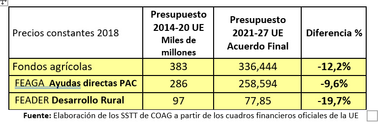 El acuerdo final de los 27 recoge un descenso del gasto agrario en términos reales (-12,2%), más drástico en el en el capítulo de desarrollo rural (-19,7%) que en el pilar de ayudas directas de la PAC ( -9,6%). El análisis comparativo realizado por COAG cuantifica este “hachazo” en 47.000 millones de euros (repartidos en 7 años) respecto al marco financiero 2014-2020. La pérdida anual a nivel comunitario ascendería a 6.700 millones €, de los que 804 millones € corresponderían a España, dado que la participación de nuestro país en los fondos agrarios es del 12%.