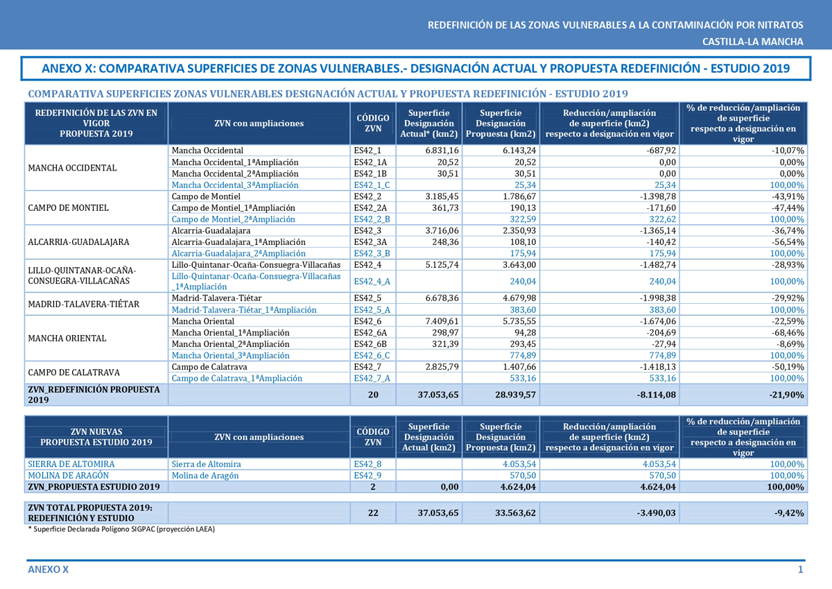 En la revisión de las actuales 7 zonas ya mencionadas hay superficies que dejan de pertenecer a las mismas, aunque también hay ampliaciones. En todas ellas, salvo en Mancha Oriental (que crece), el balance supone una reducción del territorio calificado como vulnerable, de manera que, en su conjunto, estas zonas se reducen en un 21,90%, lo que supone 811.408 hectáreas menos, con lo que se quedarían en cerca de 2,9 millones de hectáreas.