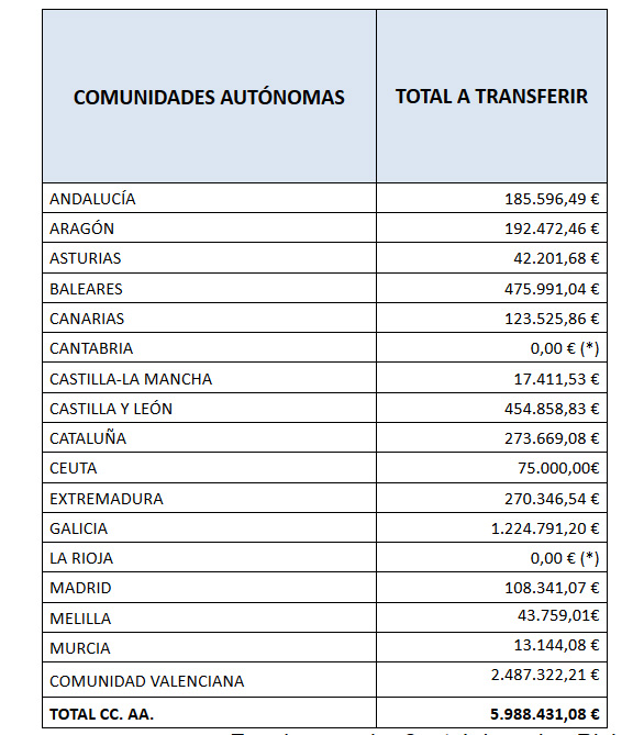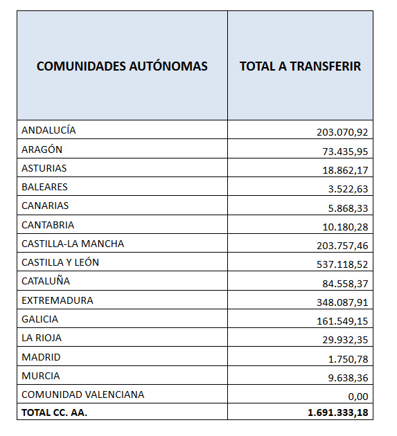 La distribución entre las comunidades autónomas es la siguiente: